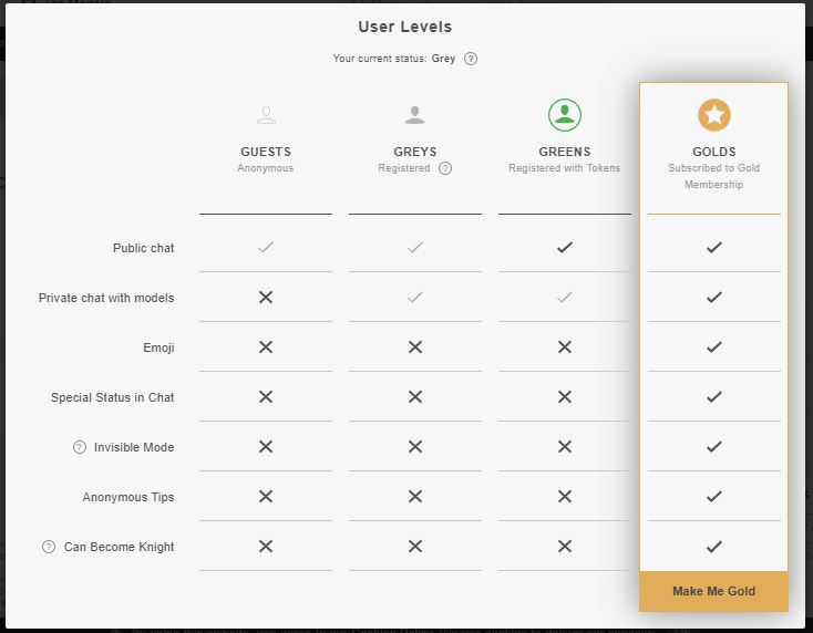 The user levels at Xhams is another forgery of Stripchat.com. You can always read our Stripchat review to know in-depth about its legitimacy over BBW cams. The levels are distinguished into 4 types: Guests, Greys, Greens, Golds.